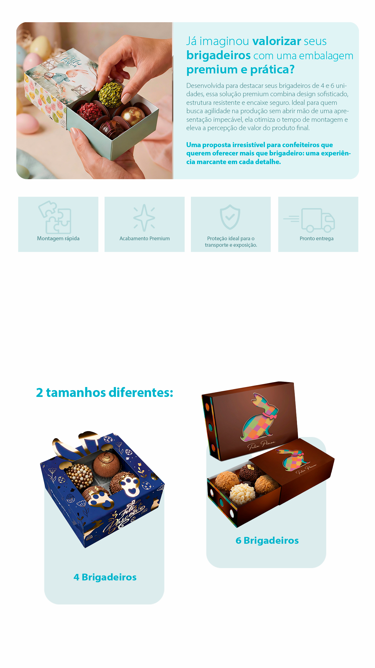 Embora tenham sido criadas especialmente para brigadeiros, essas embalagens também são ideais para outras variações amadas pelos consumidores, como beijinho, ninho com Nutella, brigadeiro dois amores e versões gourmet personalizadas. Seu design interno permite que os doces fiquem bem posicionados, valorizando a experiência de quem recebe.