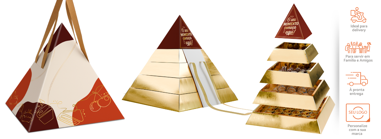 Com um design imponente e criativo, a pirâmide encanta já no primeiro olhar. A alça torna o transporte prático e elegante, perfeita para quem deseja oferecer um presente diferenciado ou encantar no delivery. Ao ser aberta, cada bandeja se transforma em um degrau de sabores, valorizando doces, salgados e pequenas delícias como se fossem verdadeiras joias gastronômicas.