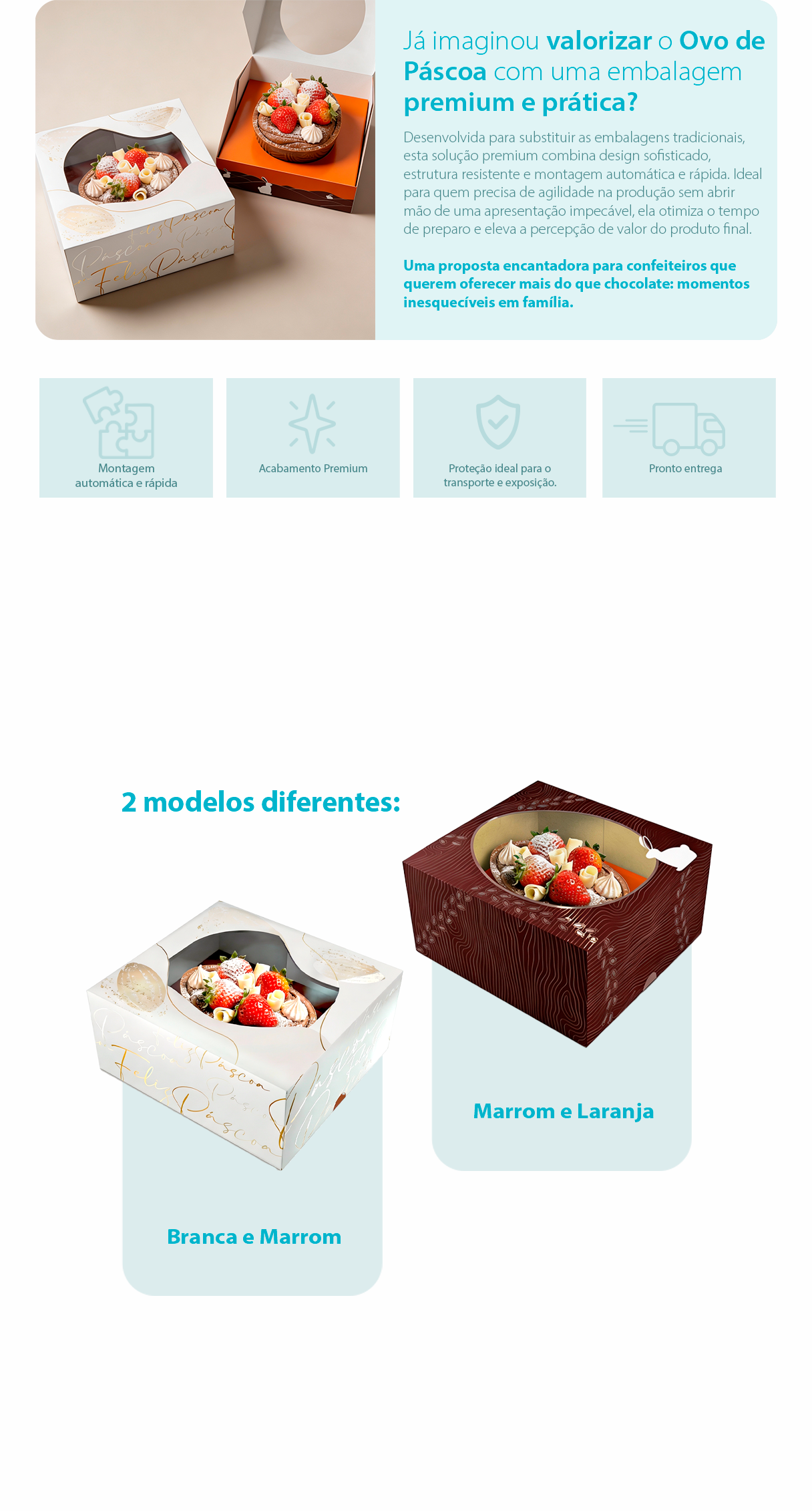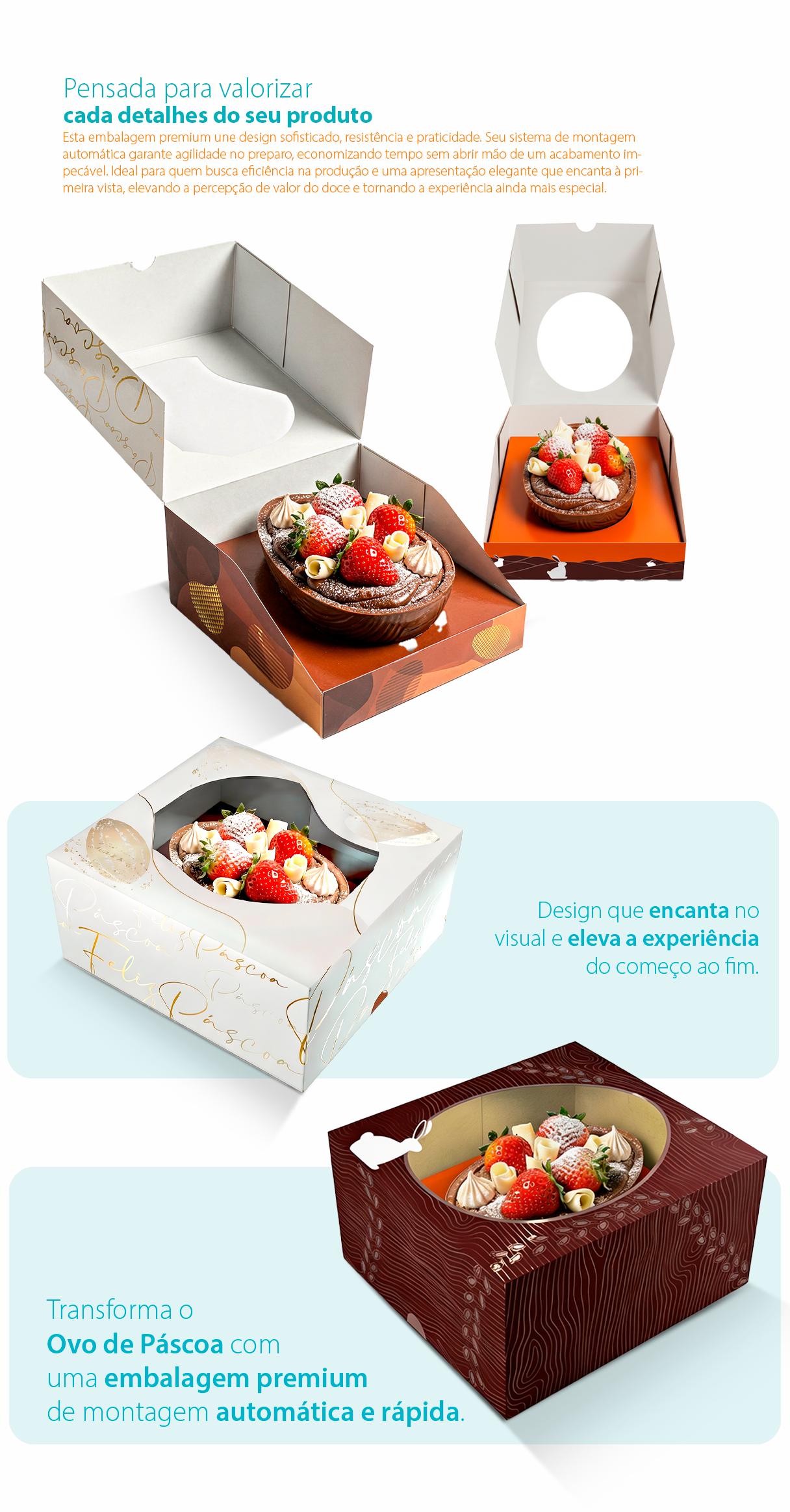 Pensada para valorizar cada detalhe do seu produto, nossa embalagem para ovo de Páscoa combina praticidade, resistência e um visual encantador. Com montagem automática e estrutura firme, ela facilita sua produção e garante mais agilidade no dia a dia.
