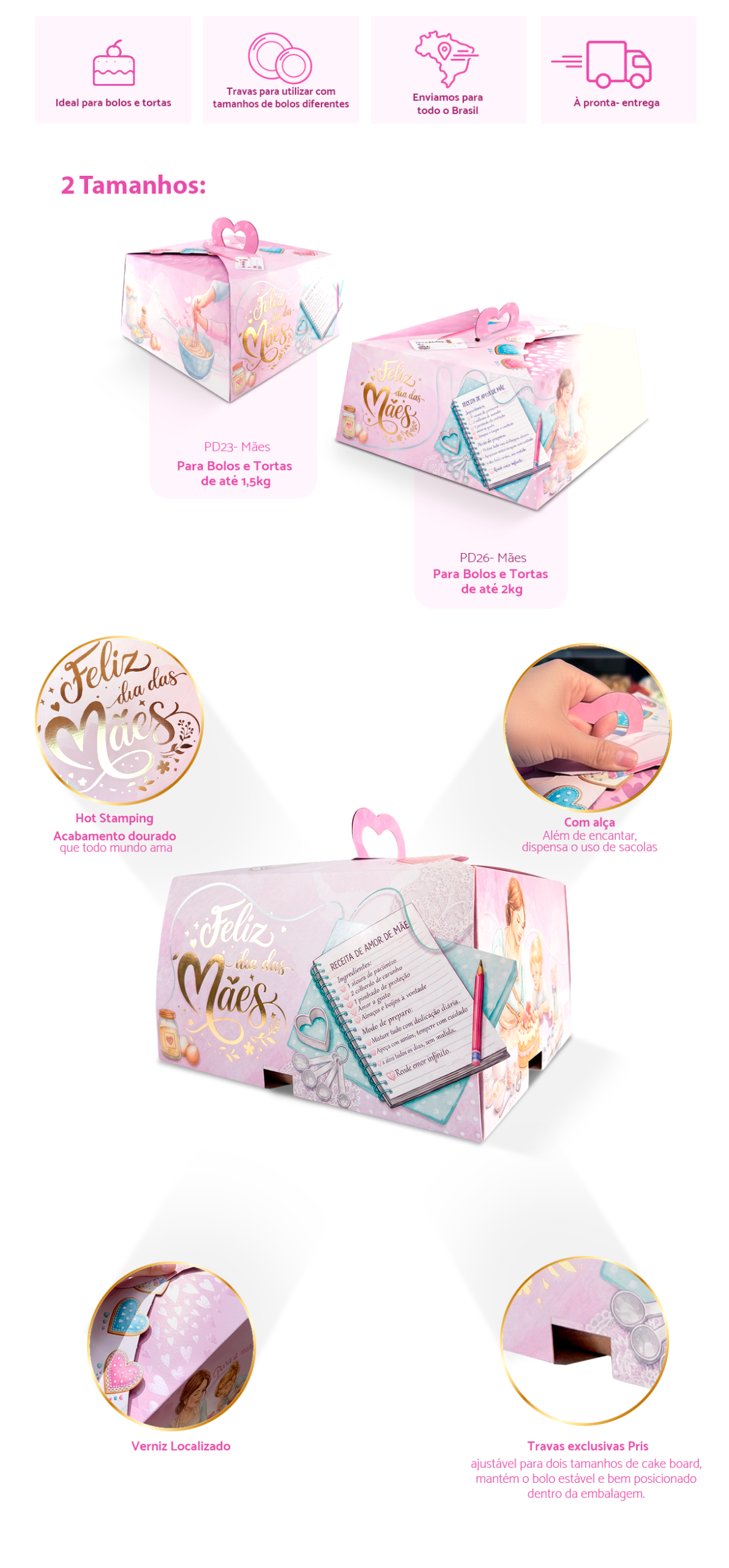 | PD26-MÃE | 31,5 x 31,5 x 13 cm | Bolos de até 2 kg |