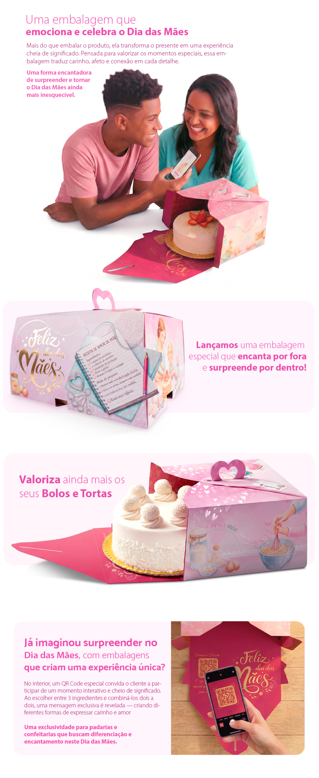 Transforme o Dia das Mães em uma experiência inesquecível com as embalagens para bolos da Pris Embalagens. Desenvolvidas com design exclusivo, recortes especiais e uma arte emocionante, essas embalagens são mais que proteção: são verdadeiros presentes. O acabamento premium com hot stamping dourado e verniz localizado traz brilho e sofisticação em cada detalhe, valorizando o produto e decorando as vitrines da padaria com muito charme.